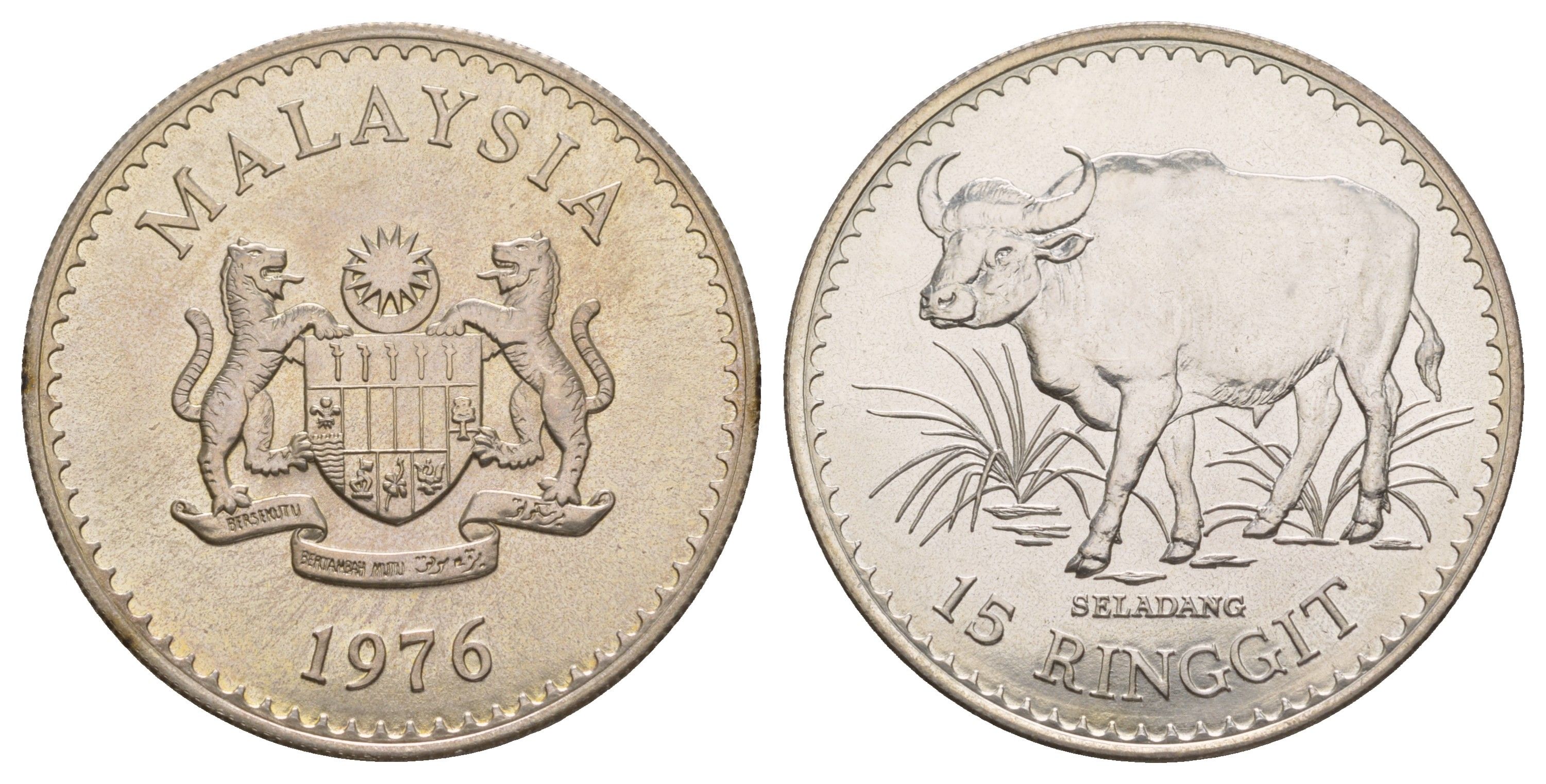 ----Малайзия 15 ринггит 1976 Охрана дикой природы - Малайзийский гаур KM 19 серебро BU 413-4134