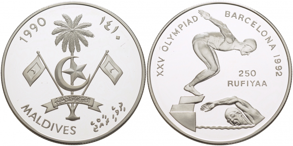 Мальдивские острова 250 руфий 1990 XXV Олимпийские игры в Барселоне 1992 года, плавание KM 85 серебро PROOF 04-315-22