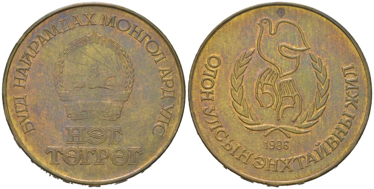----Монголия 1 тугрик 1986 Международный год мира KM 48 алюминиевая бронза 4599-1125