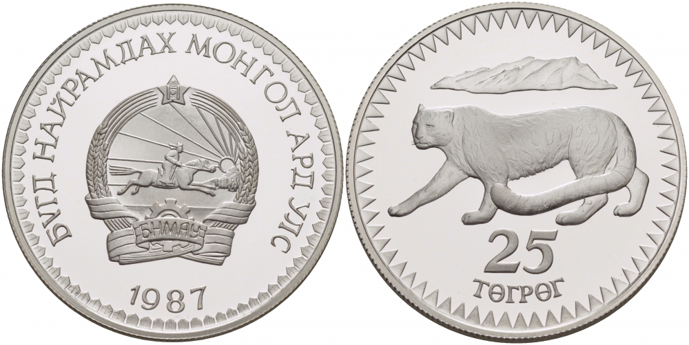 Монголия 25 тугриков 1987 серия сохраним наш мир, снежный леопард KM 50 серебро PROOF 01-146-44