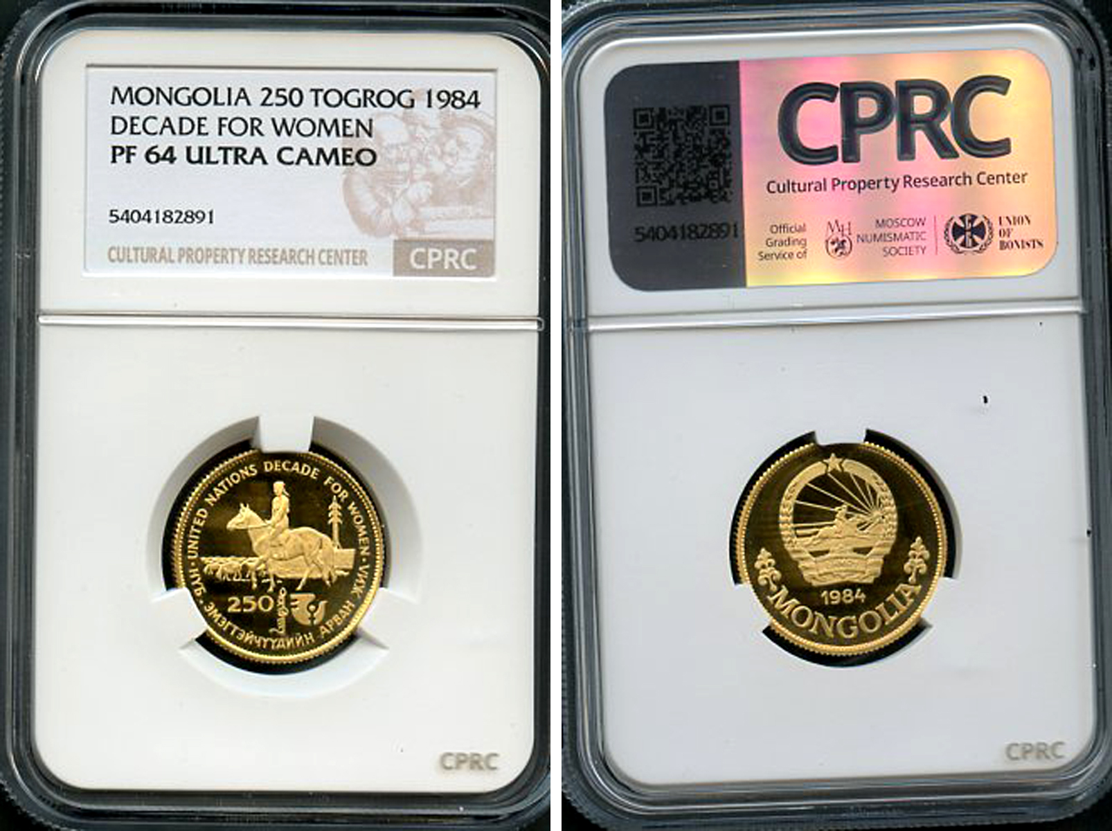 Монголия 250 тугриков 1984 международный год женщин, тираж 510 экземпляров, в слабе CPRC сохранность PF 64 Ulta Cameo KM 45 золото PROOF 15-022-07
