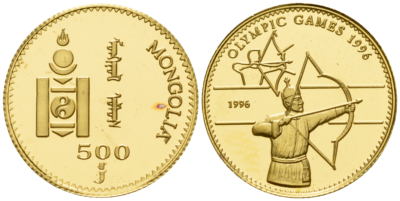 Монголия 500 тугриков 1996 олимпийские игры 1996 года в Атланте, стрельба из лука золото PROOF 00-815-38