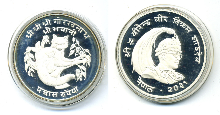 НЕПАЛ 50 РУПИЙ 1974 КРАСНАЯ ПАНДА, В КОРОБКЕ KM 841а серебро PROOF 6-1-23