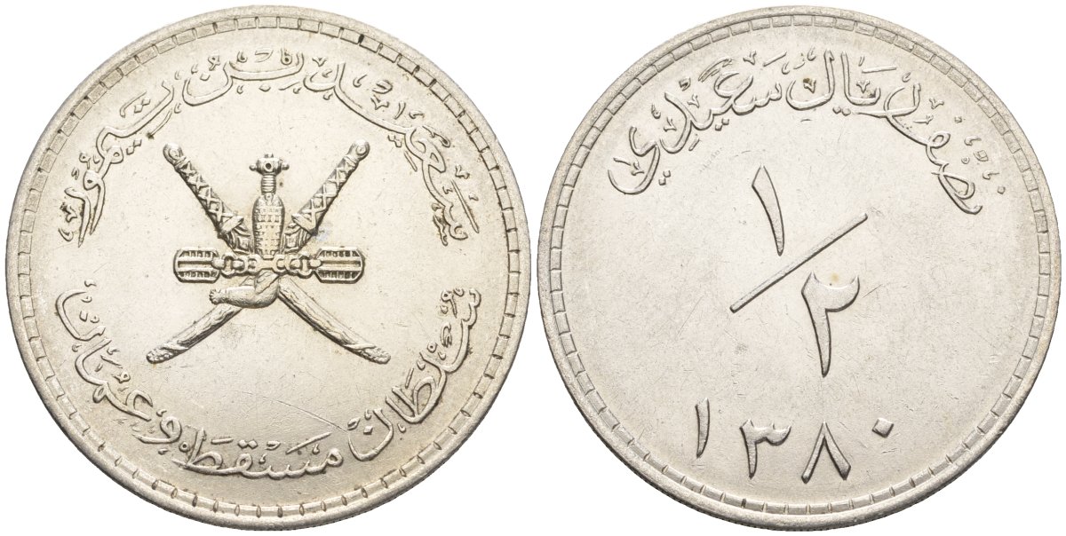 Султанат Маскат и Оман 1/2 саиди риала 1960 AH 1380, Саид бен Таймур аль-Саид (1932-1970) KM 34 серебро 1527-923