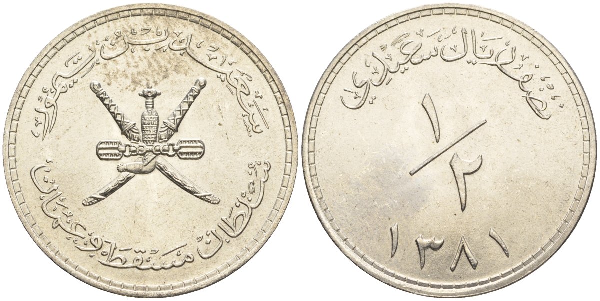 Султанат Маскат и Оман 1/2 саиди риала 1961 AH 1381, Саид бен Таймур аль-Саид (1932-1970) KM 34 серебро 1527-1011