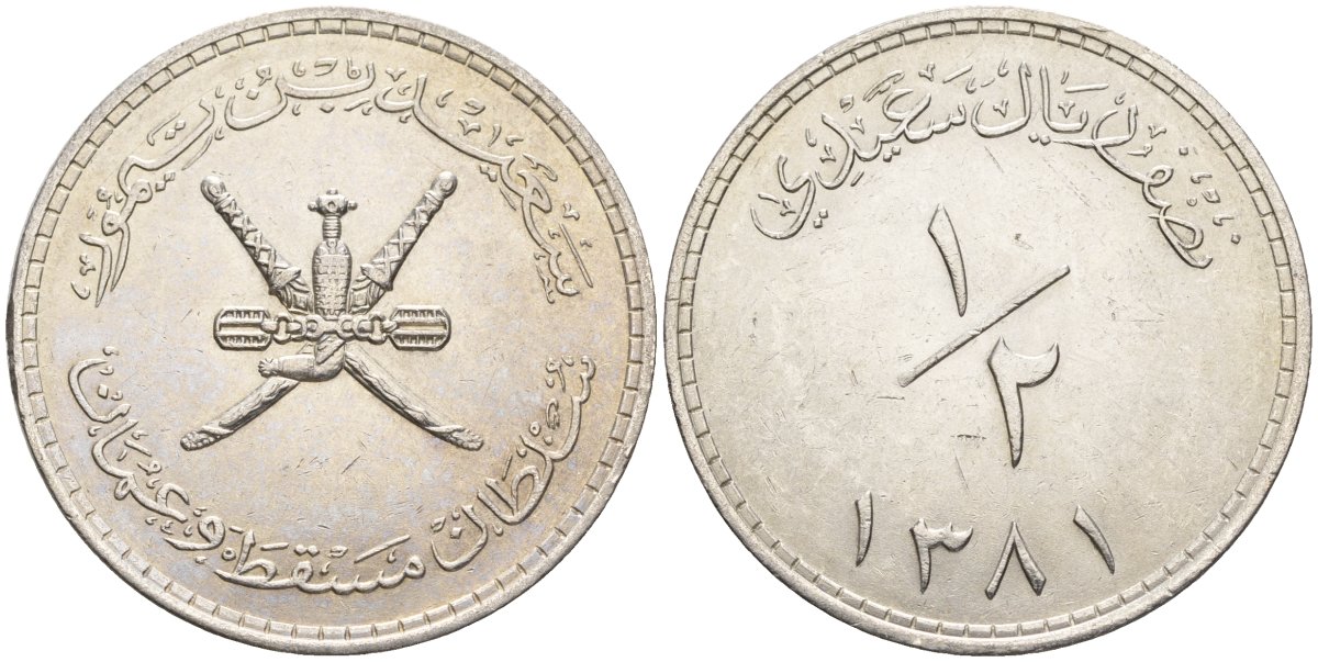 Султанат Маскат и Оман 1/2 саиди риала 1961 AH 1381, Саид бен Таймур аль-Саид (1932-1970) KM 34 серебро 1527-942