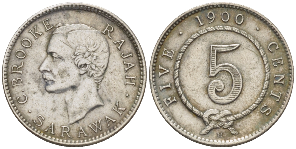 Саравак 5 центов 1900 Н, Чарльз Энтони Джонсон Брук, Королевство Саравак (1846 - 1946) KM 8 серебро XF 4044-944