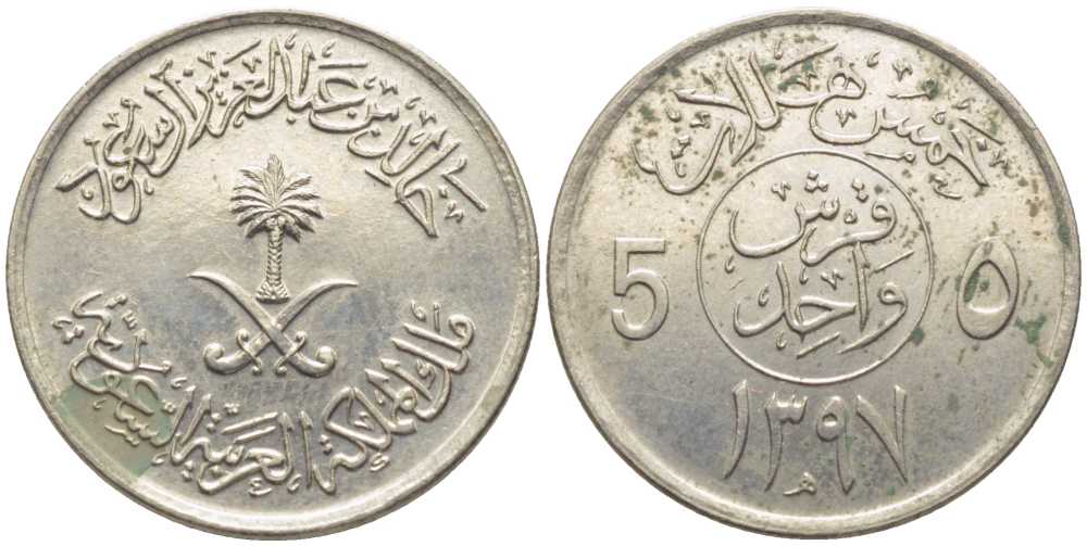 -Саудовская Аравия 5 халала 1976 AH 1397 KM 53 медно-никель 112-868Нидерландская ИндияАфганистанТиморТурцияФилиппиныШри-Ланка (Цейлон)ЯпонияЮжная АравияАрменияАзербайджанСтрейтс-СетлментсБангладешБрунейКамбоджаОбъединенные Арабские ЭмиратыТайваньФранцузский ИндокитайСаравакУзбекистанЕдиная КореяКатарМолдавия (Молдова)КиргизияКазахстанГрузияТуркменияТибетТаджикистанЮжная КореяБахрейнБирма (Мьянма)БутанВьетнамГонконгИзраильИндияИндонезияИорданияИракИранЙеменКитайСеверная КореяТаиландКувейтЛаосЛиванМакаоМалайзияМальдивыМонголияНепалОманПакистанСингапурСирияДругие страны