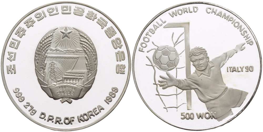 Северная Корея 500 вон 1989 Чемпионат мира по футболу в Италии 1990 года, вратарь KM 38 серебро PROOF 1072-5-64