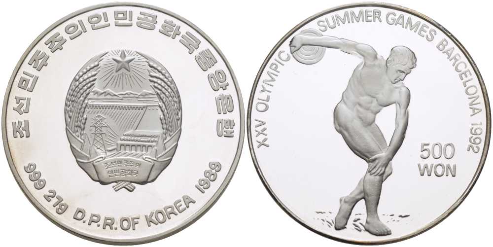 КНДР (Северная Корея) 500 вонов 1989 XXV Олимпийские игры 1992 года в Барселоне, дискобол KM 34 серебро PROOF 1074-8-32KM 34 серебро PROOF 1074-8-32