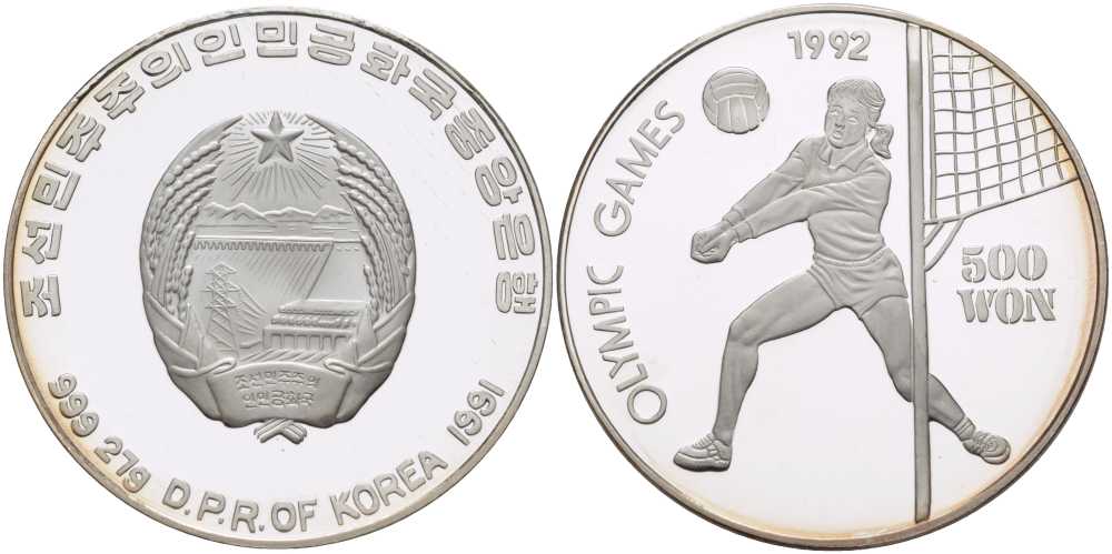 КНДР (Северная Корея) 500 вонов 1991 XXV Олимпийские игры 1992 года в Барселоне, волейбол KM 63 серебро PROOF 06-204-33