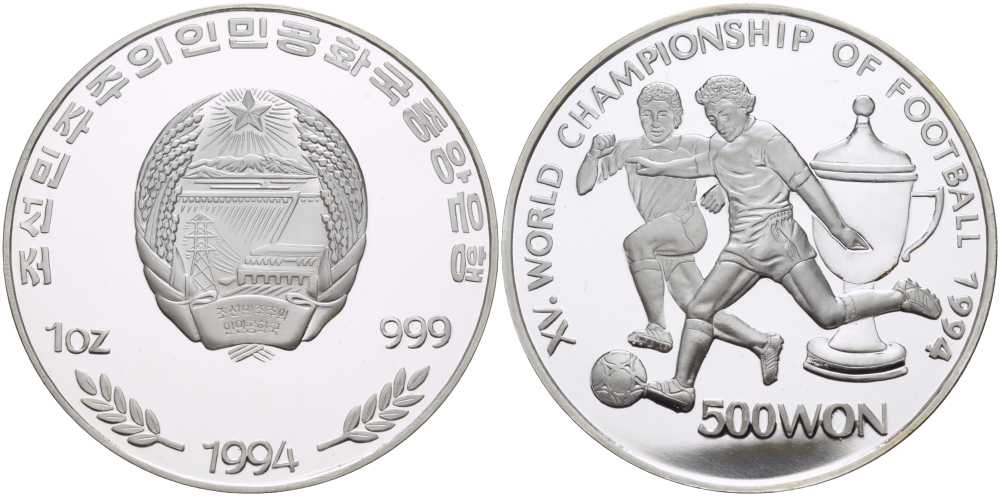 Северная Корея 500 вон 1994 XV Чемпионат мира по футболу во Франции 1998 года, два игрока на фоне кубка KM 145 серебро PROOF 02-108-21