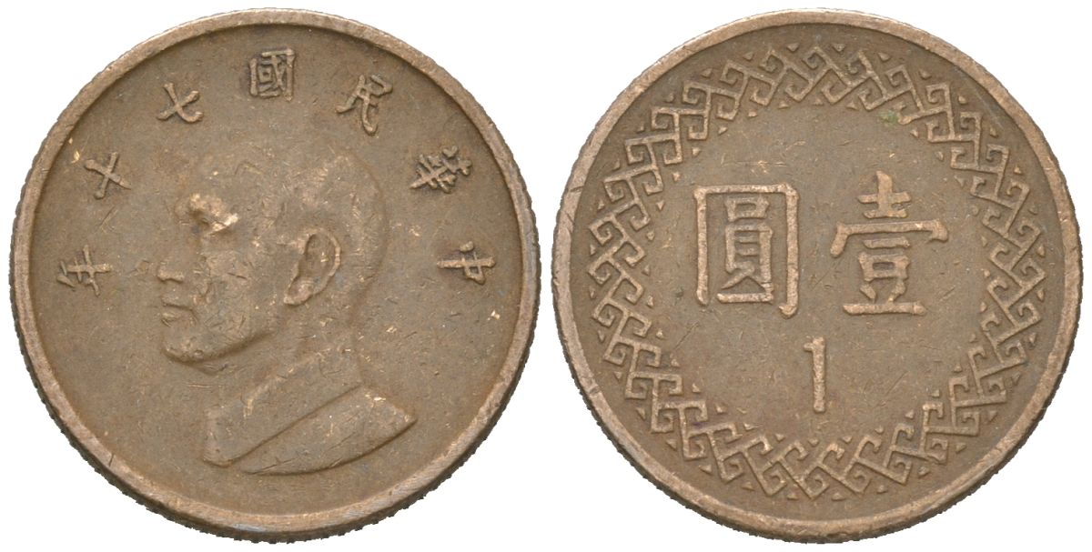 ----Тайвань 1 доллар 1981 год 70, Чан Кайши Y 551 алюминиевая бронза 4617-1049