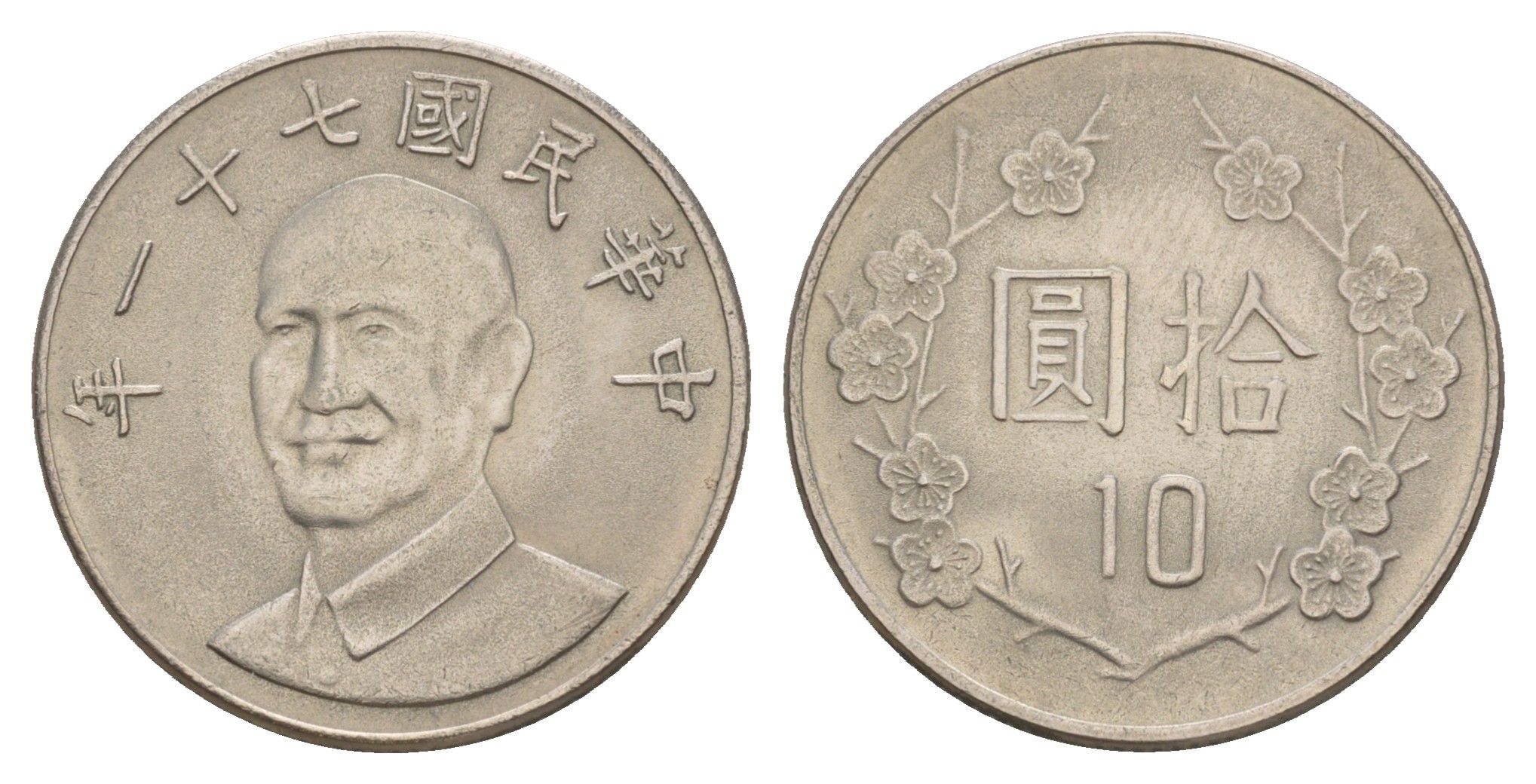 Тайвань 10 долларов 1982 год 71, Чан Кайши Y 553 медно-никель aUNC 4654-314
