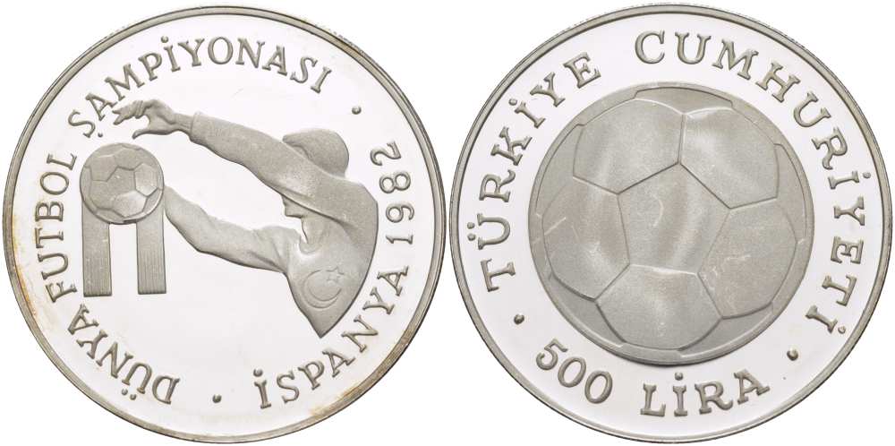 Турция 500 лир 1982 Чемпионат мира по футболу в Испании 1982 года, мяч, вратарь KM 953 серебро PROOF 1074-4-52