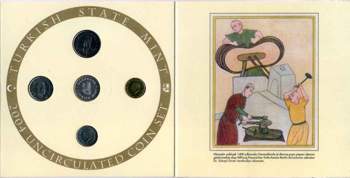 Турция официальный набор из 4 монет + жетон 2004 25000, 50000, 100000 и 250000 лир, буклет медно-никель UNC 7-3-36