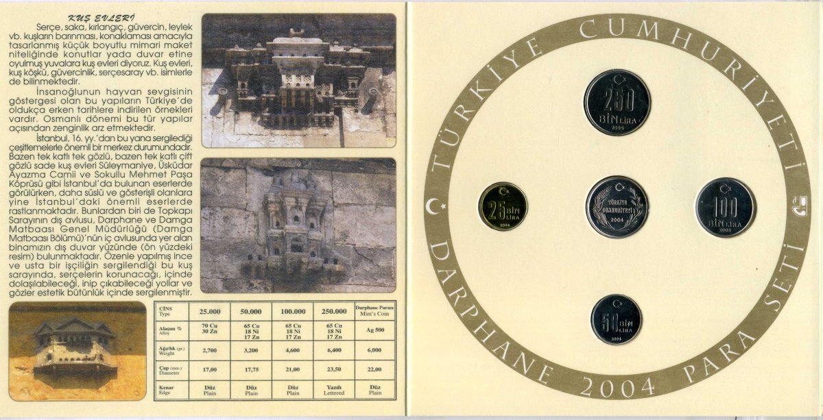 Турция официальный набор из 4 монет + жетон 2004 25000, 50000, 100000 и 250000 лир, буклет медно-никель UNC 7-3-37