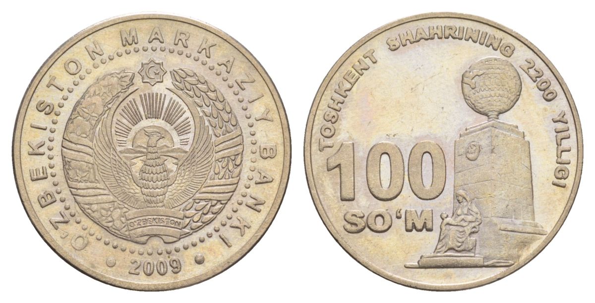 Узбекистан 100 сумов 2009 2200 лет городу Ташкент, монумент «Муста?иллик ва эзгулик» KM 32 сталь плакированная никелем UNC 4633-931