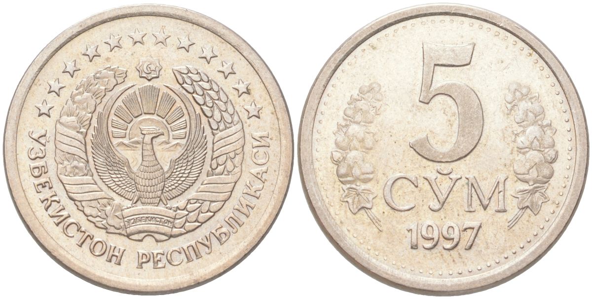Узбекистан 5 сумов 1997 KM 9 сталь плакированная никелем aUNC 4141-1147