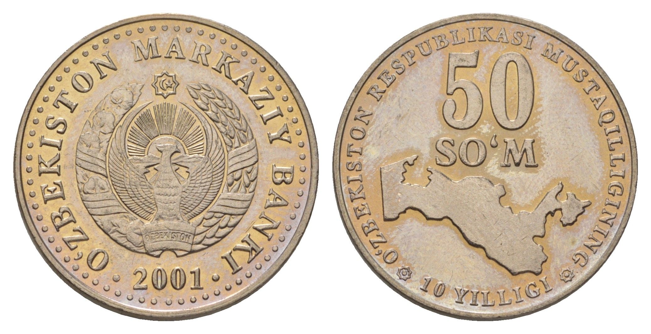 Узбекистан 50 сумов 2001 10 лет независимости Узбекистана, 8 Грамм KM 15a сталь плакированная никелем UNC 4626-352