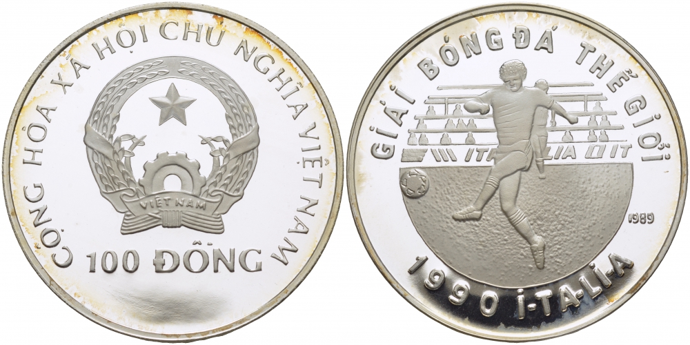 Вьетнам 100 донг 1989 Чемпионат мира по футболу в Италии 1992 года, игрок KM 30 серебро PROOF 1071-10-24