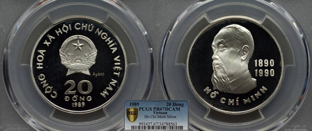 ВЬЕТНАМ 20 ДОНГОВ 1989 100 ЛЕТ СО ДНЯ РОЖДЕНИЯ ХО ШИ МИНА (1890-1990), В СЛАБЕ PCGS PR 67 DCAM KM 40а серебро PROOF 00-000-00