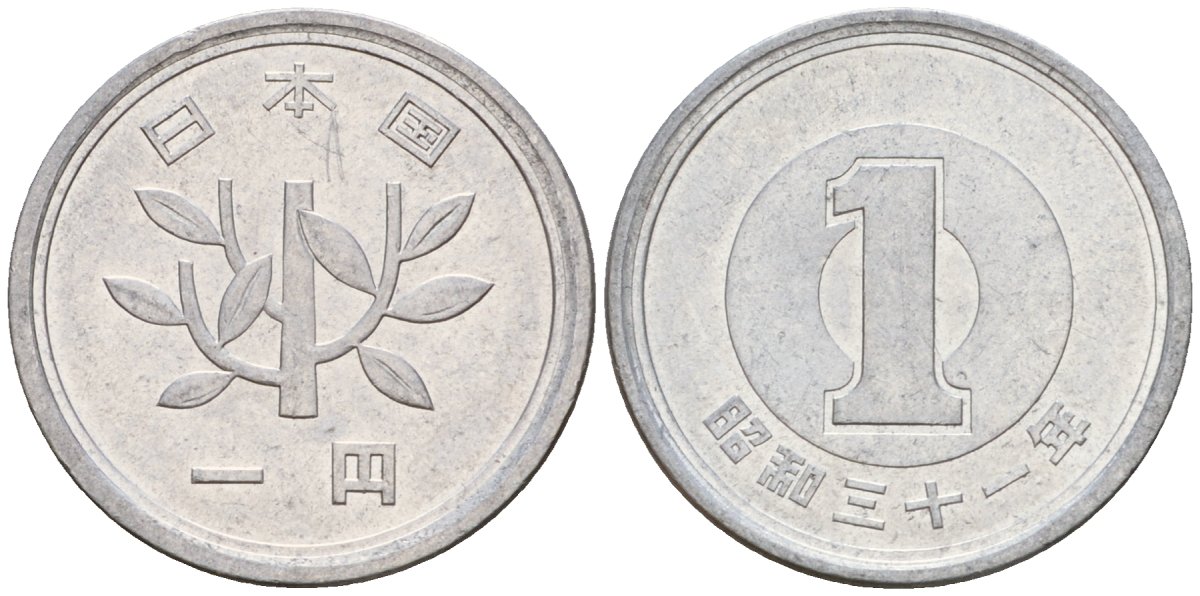 Япония 1 йена 1956 Император Хирохито Сева (1926-1989), Год 31 Y 74 алюминий 4187-1233