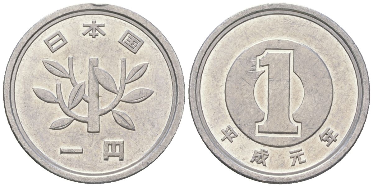 Япония 1 йена 1989 1 год Акихито (Хэйсэй) (1989 - 2019) Y 95 алюминий 4177-447