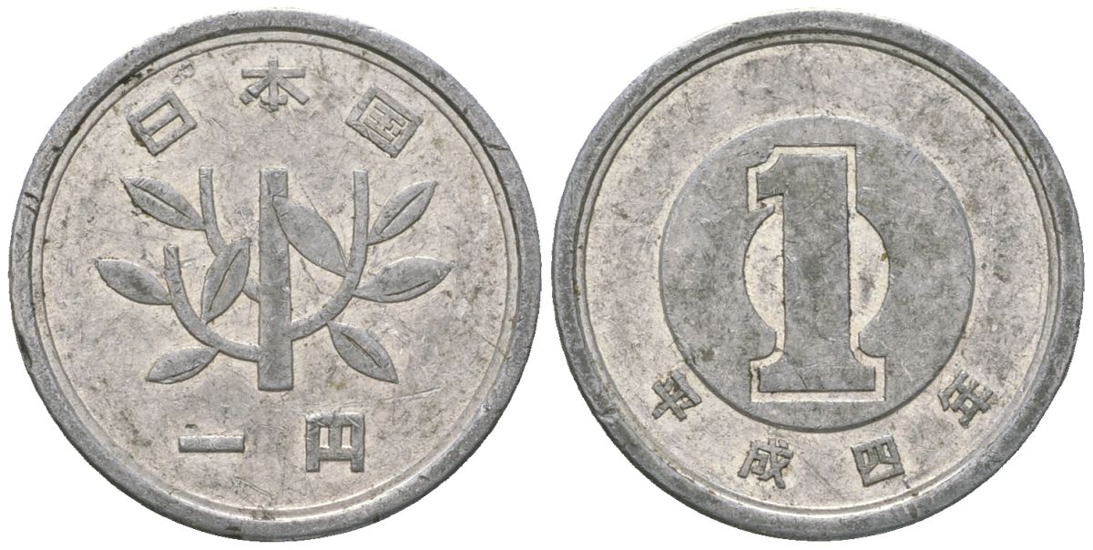 Япония 1 йена 1992 4 год Акихито (Хэйсэй) (1989 - 2019) Y 95 алюминий 4177-643