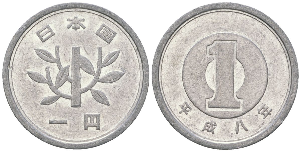 Япония 1 йена 1996 8 год Акихито (Хэйсэй) (1989 - 2019) Y 95 алюминий 4177-651