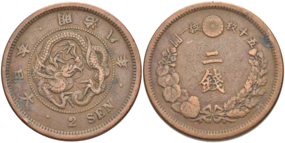 ЯПОНИЯ 2 СЕНЫ 1875 ГОД 8 ПРАВЛЕНИЯ ИМПЕРАТОРА МУЦУХИТО (МЭЙДЗИ) (1867-1912) KM 18.1 (18) бронза 3851-615