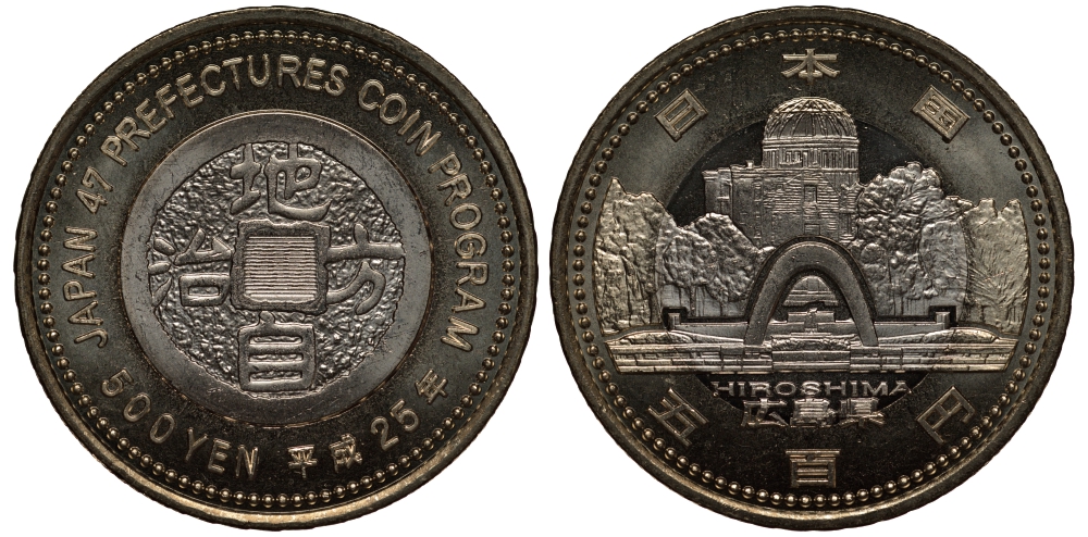 Япония 500 йен 2013 25 год, серия 47 префектур Японии, Хиросима KM 198 биметалл UNC M21-05