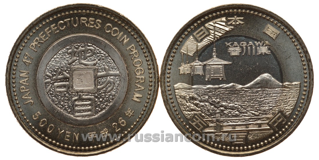 Япония 500 йен 2014 26 год, серия 47 префектур Японии, Кагава, гора и бумажные фонарики KM 217 биметалл UNC M29-9