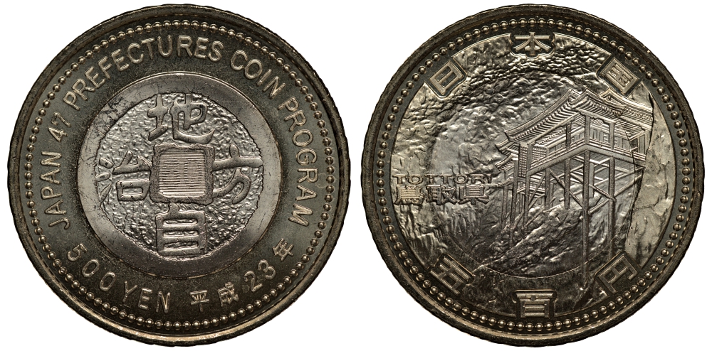 ЯПОНИЯ 500 ЙЕН (23) 2011 СЕРИЯ 47 ПРЕФЕКТУР ЯПОНИИ, ТОТТОРИ, ЗАЛ В ХРАМЕ МИТОКУСАН KM 173 биметалл UNC M21-16