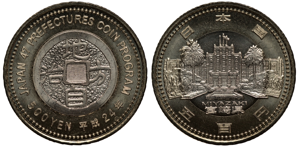 ЯПОНИЯ 500 ЙЕН (24) 2012 СЕРИЯ 47 ПРЕФЕКТУР ЯПОНИИ, МИЯДЗАКИ, 'ДВОРЕЦ' (ЗДАНИЕ ПРЕФЕКТУРЫ) KM 187 биметалл UNC M19-12