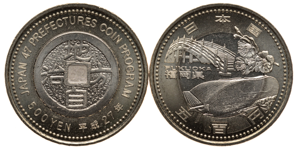 ЯПОНИЯ 500 ЙЕН 27 (2015) СЕРИЯ 47 ПРЕФЕКТУР ЯПОНИИ, ФУКУОКА, стадион, мост, цветок рододендрона KM 232 биметалл UNC M25-1
