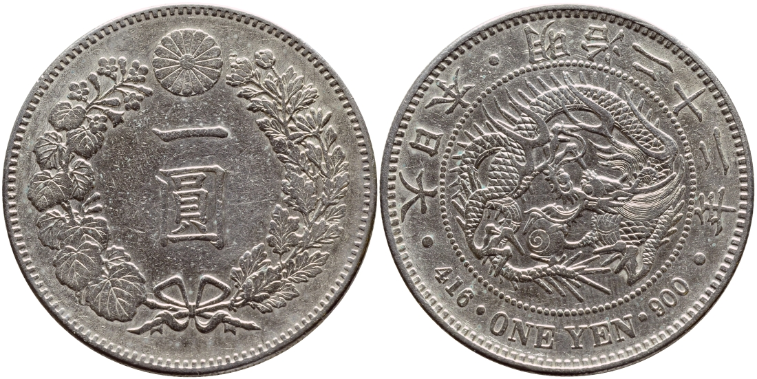 Япония 1 йена 1889 диаметр 38,1 мм, 22 год правление Императора Муцухито (Мэйдзи), Осака KM A25.3 серебро 00-809-82