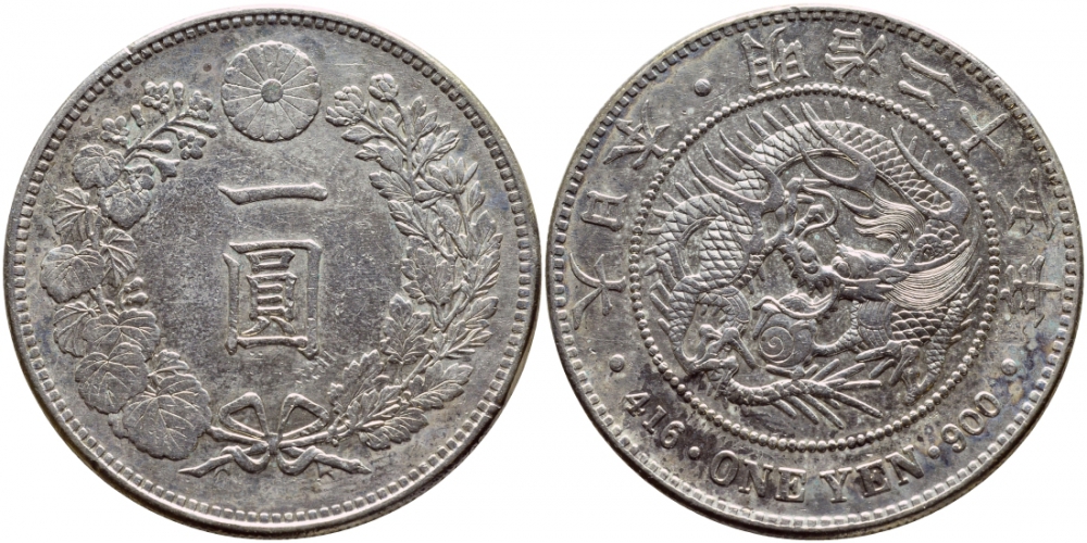 ----Япония 1 йена 1892 пламя выходит между 4 и 5-м позвонком, диаметр 38,1 мм, 25 год правления императора Мэйдзи (Муцухито), Осака, редкая KM A25.3 серебро VF-XF 00-814-24