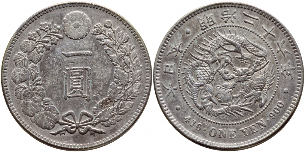 Япония 1 йена 1893 диаметр 38,1 мм, 26 год правление Императора Муцухито (Мэйдзи), Осака KM A25.3 серебро 00-1067-7-21