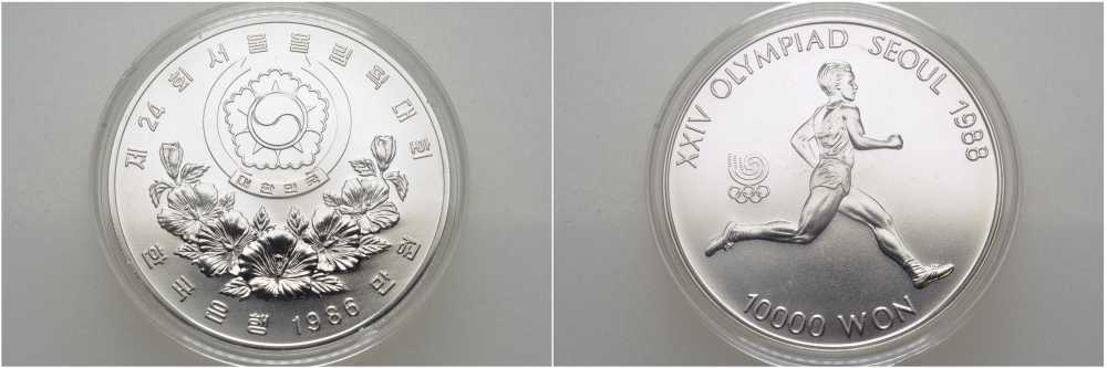 ЮЖНАЯ КОРЕЯ 10000 ВОН 1986 XXIV ОЛИМПИЙСКИЕ ИГРЫ В СЕУЛЕ, ЛЕГКАЯ АТЛЕТИКА, БЕГ, ТИРАЖ 117500 ЭКЗ., ПРОБА 925, ВЕС 33,62 ГР. KM 56 серебро UNC 1078-8-42