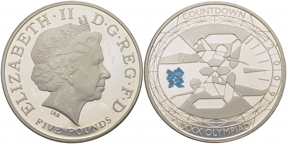 Великобритания 5 фунтов 2009 Елизавета II (1952-2022), XXX летние Олимпийские Игры, Лондон 2012 - Обратный отсчет «3», Плавание KM 1121a, Spink LO33 серебро PROOF 1077-6-22