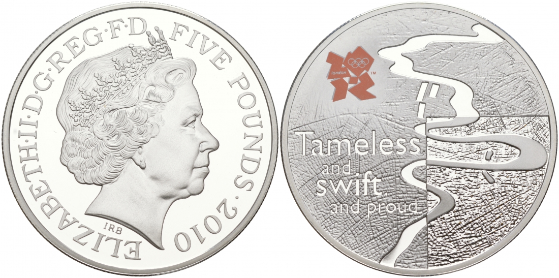 Великобритания 5 фунтов 2010 XXX Летние Олимпийские игры 2012 в Лондоне, быстрая и неукротимая река, эмаль KM NEW серебро PROOF 02-039-41