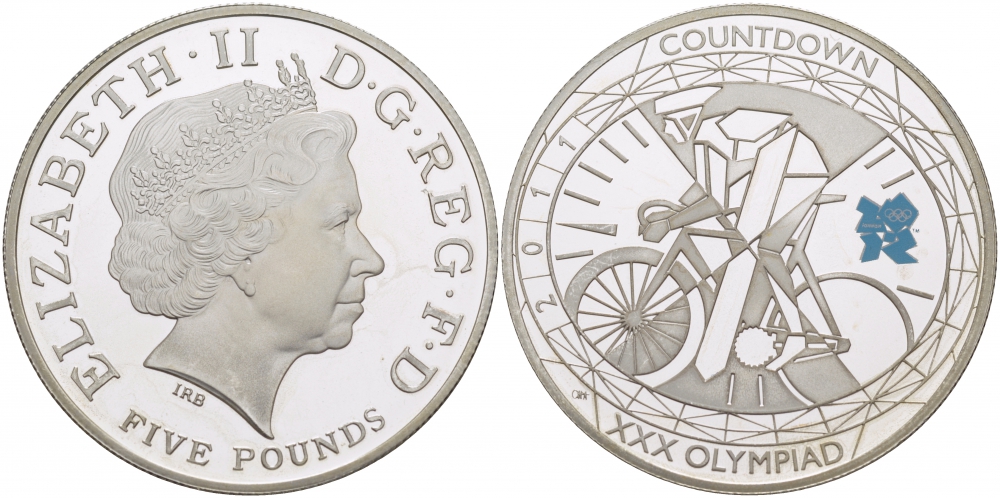 Великобритания 5 фунтов 2011 Елизавета II (1952-2022), XXX Летние Олимпийские игры 2012 в Лондоне 2012 - Обратный отсчет 1 год до начала, велосипедный спорт, KM 1202, Spink LO35 серебро PROOF 11-176-21