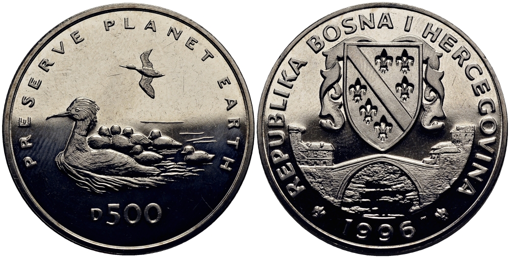 Босния и Герцеговина 500 динаров 1995 серия сохраним планету, утка с утятами KM 79 медно-никель UNC M90-06