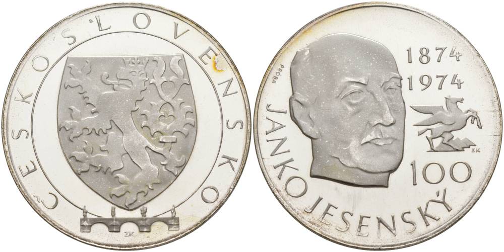 Чехословакия 100 крон 1974 100 лет со дня рождения Янко Есенского (1874-1974), пробная / проба серебро PROOF 00-822-52