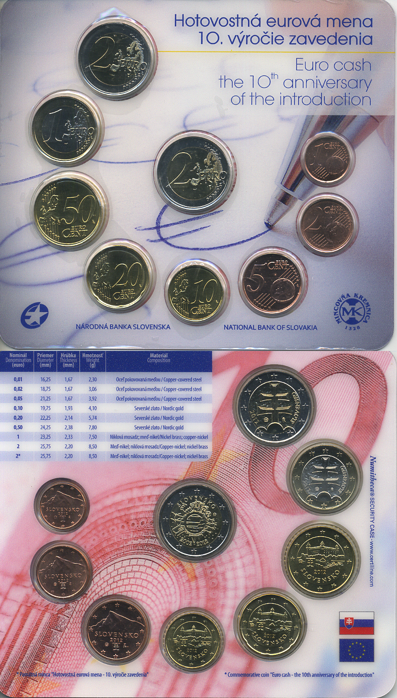 Словакия евронабор из 8 монет + 2 евро 2012 10 лет введения евро, как валюты, в пластиковой запайке и оригинальном картонном буклете UNC 1-4-2-19
