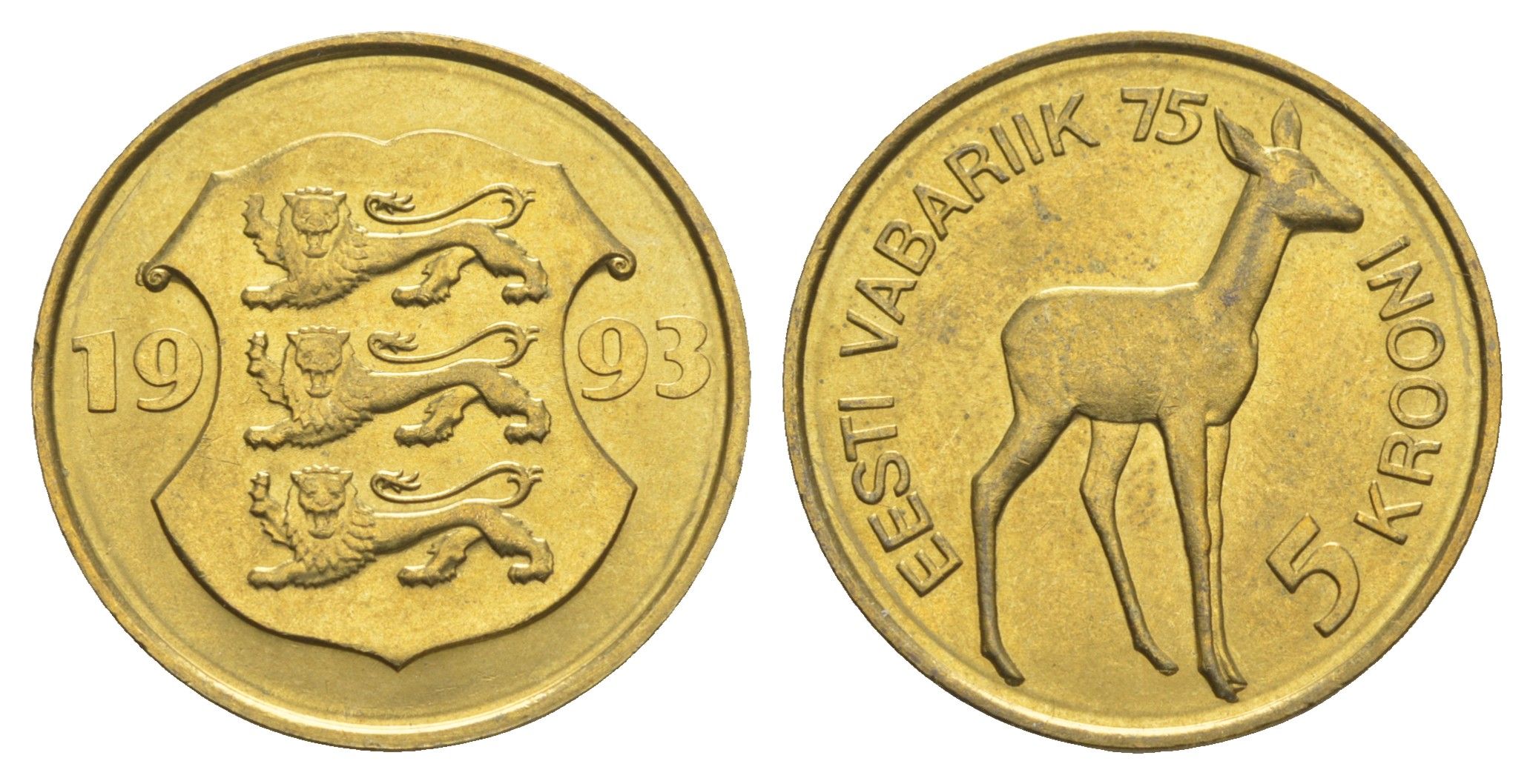 Эстония 5 крон 1993 75 лет Эстонской республике KM 29 латунь UNC 4652-935