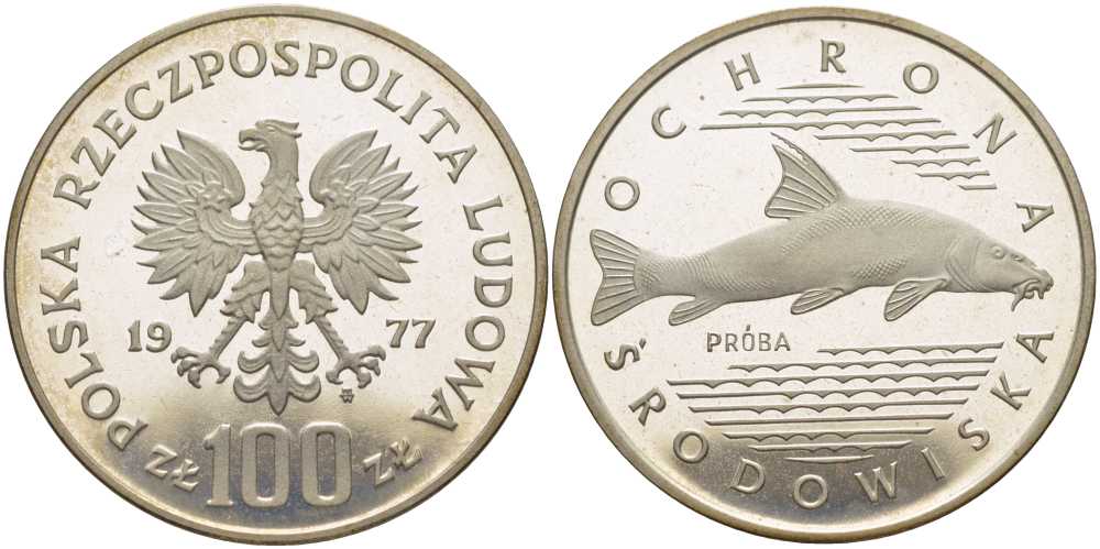 Польша 100 злотых 1977 серия охрана окружающей среды, рыба, пробный выпуск (PROBA), в оригинальной пластиковой упаковке KM Pr305 серебро PROOF 5-3-1-161