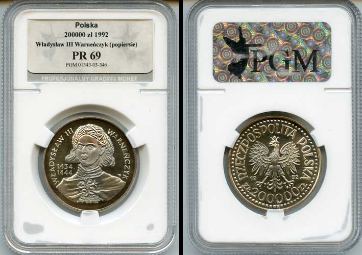 Польша 200000 злотых 1992 серия польские короли, Владислав III (1434-1444), в слабе PGM PR 69 KM 254 серебро PROOF 15-008-18