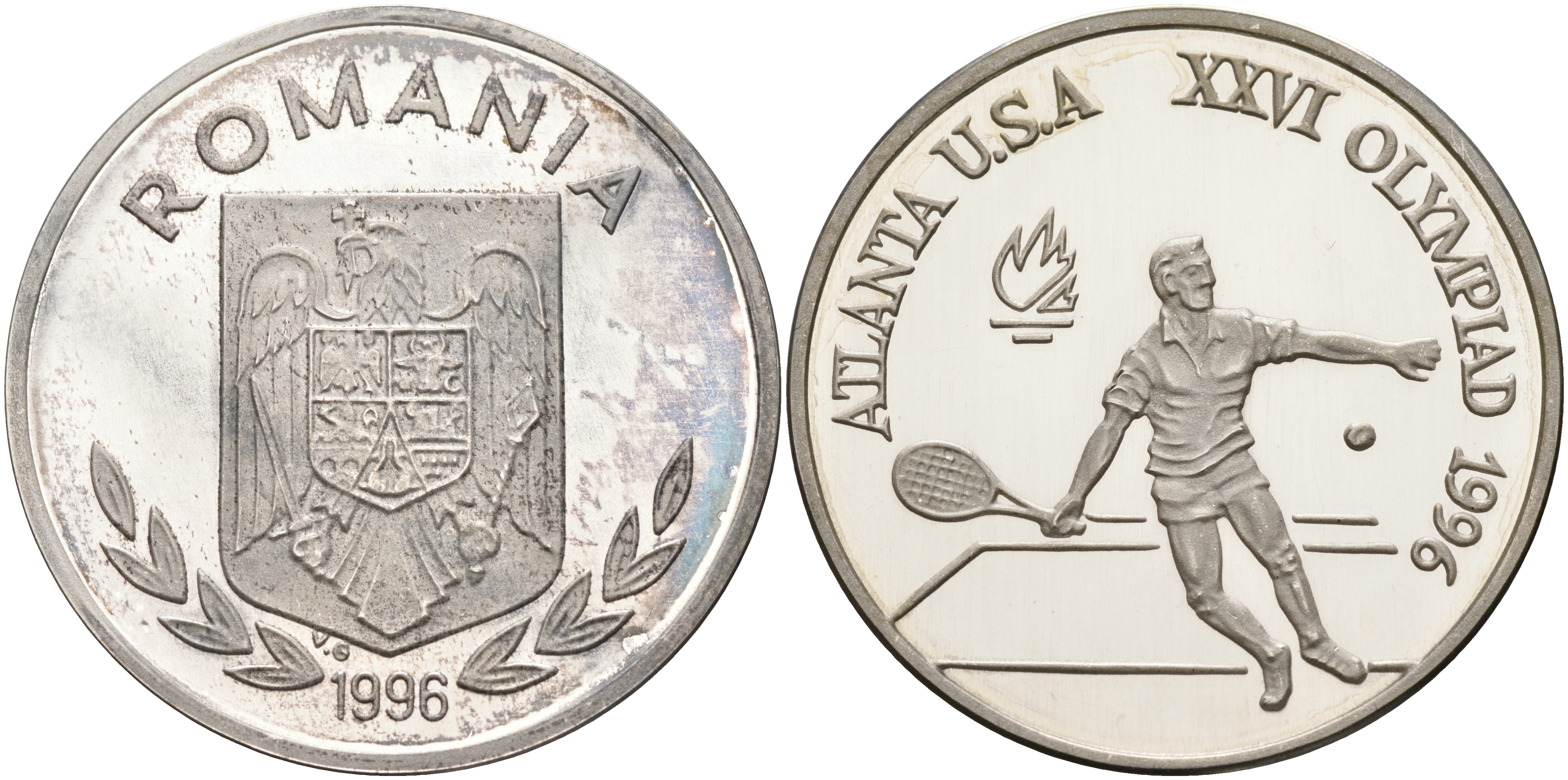 Румыния 100 леев 1996 XXVI Олимпийские игры 1996 года в Атланте, 100 лет Олимпийскому движению, большой теннис, пробный выпуск, пифорт KM PnB 315.D1 серебро PROOF 00-00